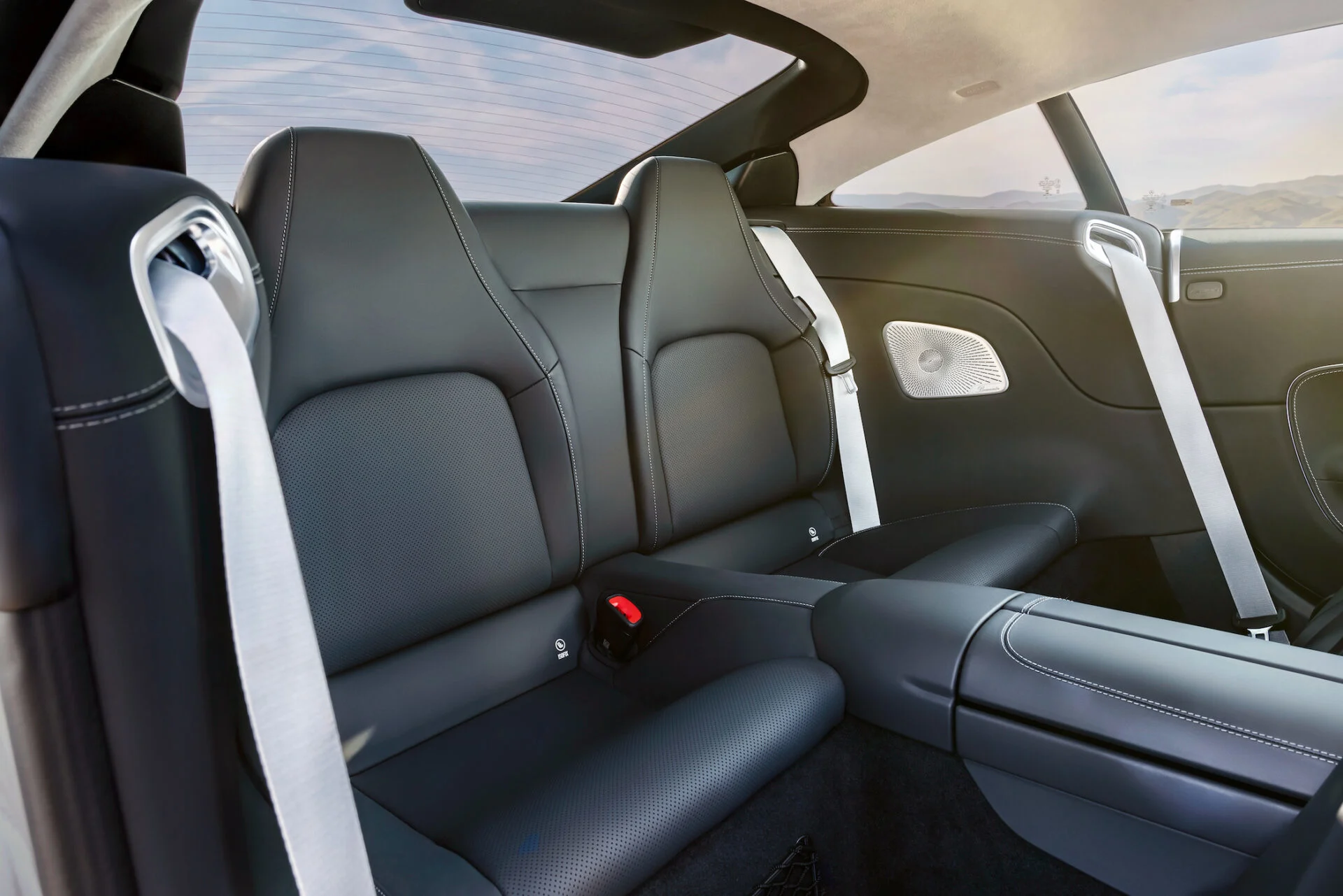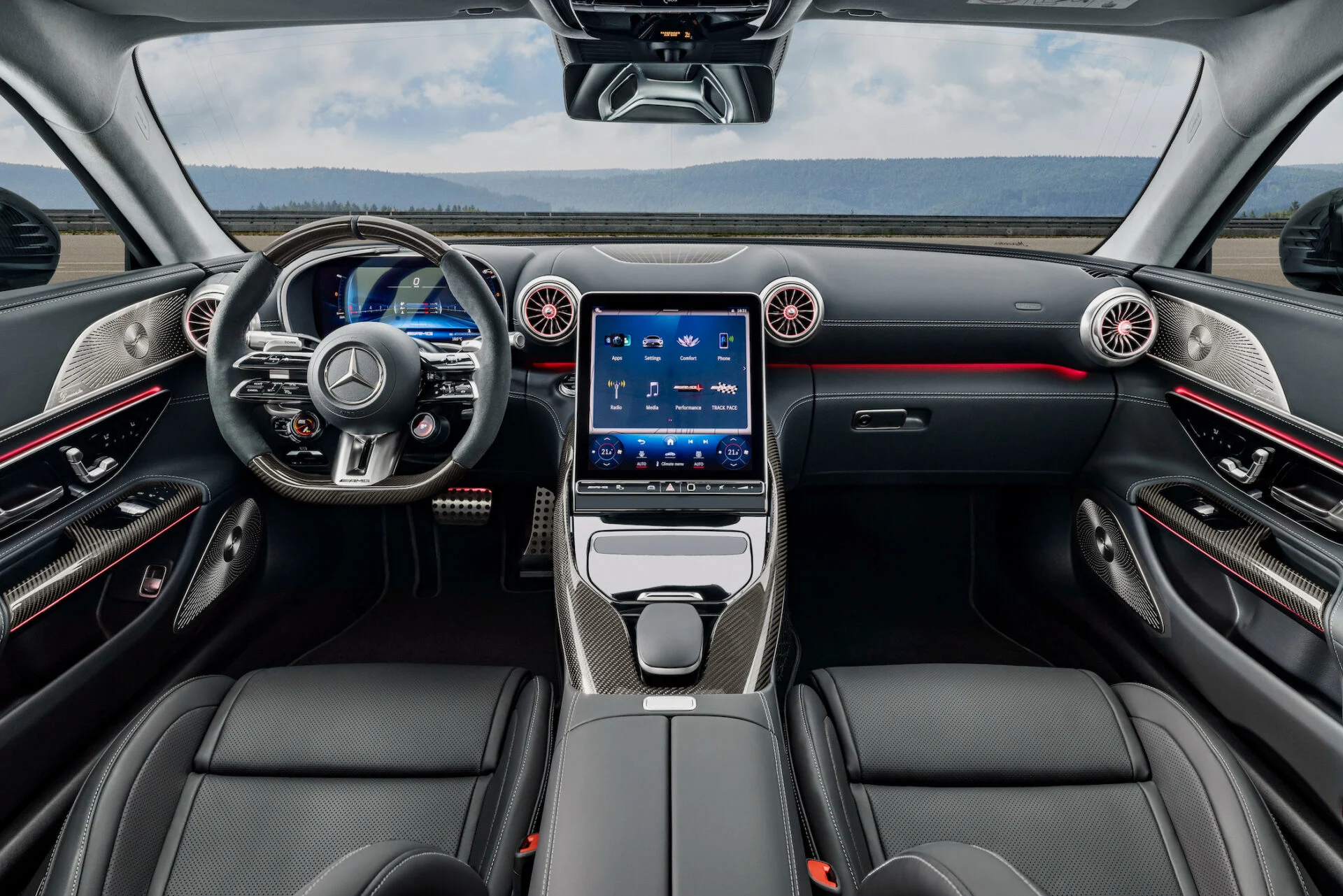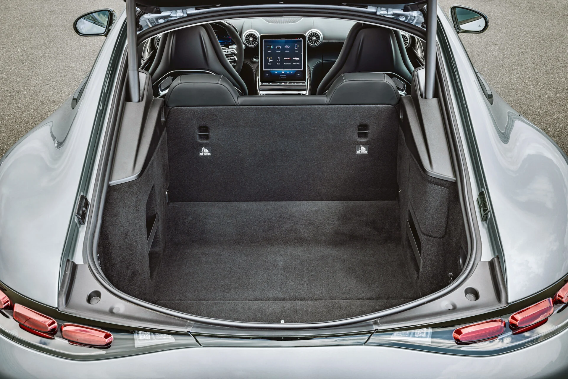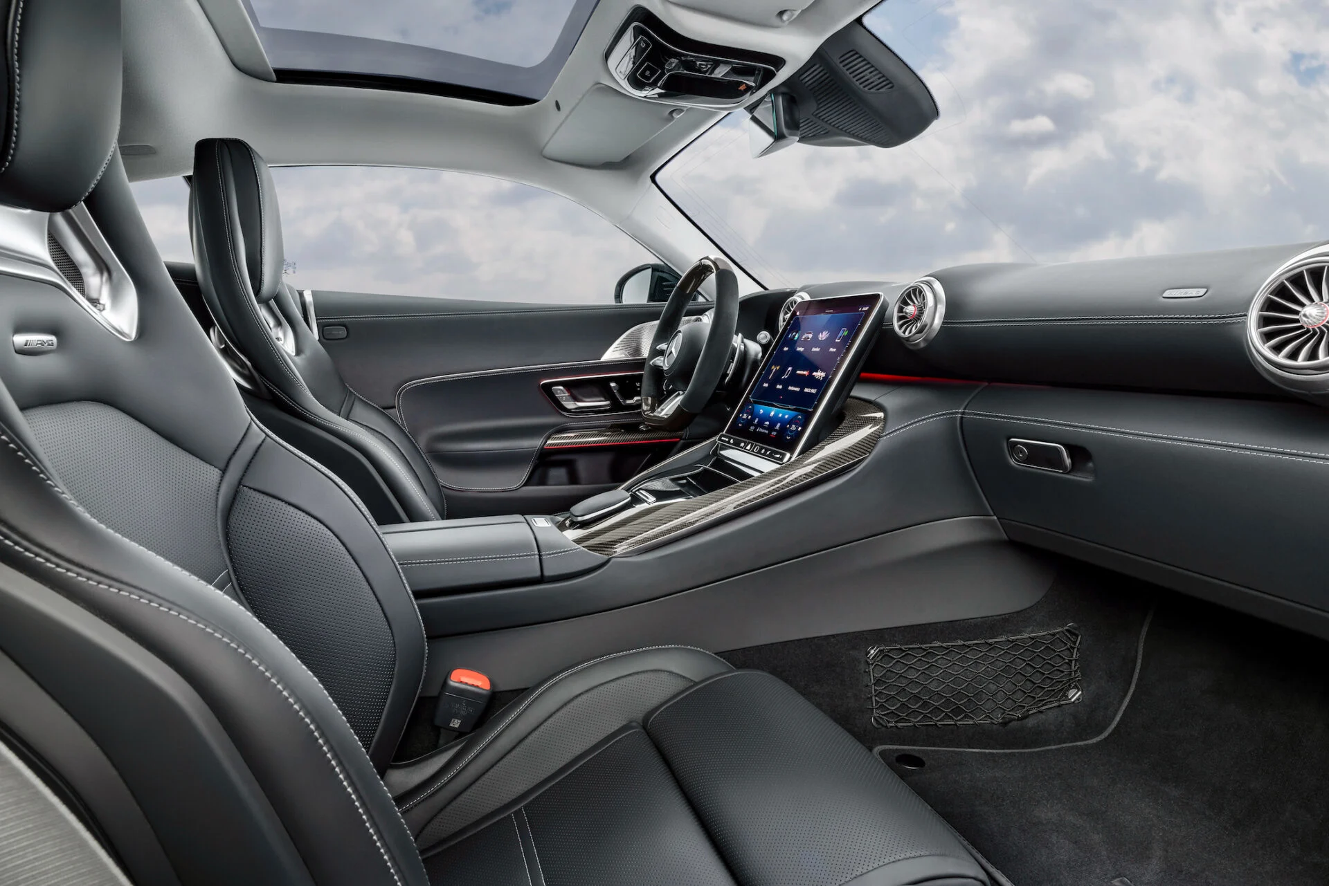 I kabinen møder man, ikke overraskende, samme indretning som i SL. Der er ikke brugt penge på at lave interiøret unikt, og fire runde luftdyser og en touchscreen i portrætformat kendetegner grundlayoutet. I forhold til interiøret i den første GT er stilen mere elegant og mindre pompøs. Og så er der det nye bagsæde, som næppe gør GT’eren til en familiebil; der er plads til to, men de skal virkelig ville med på turen i de små skålformede sæder.