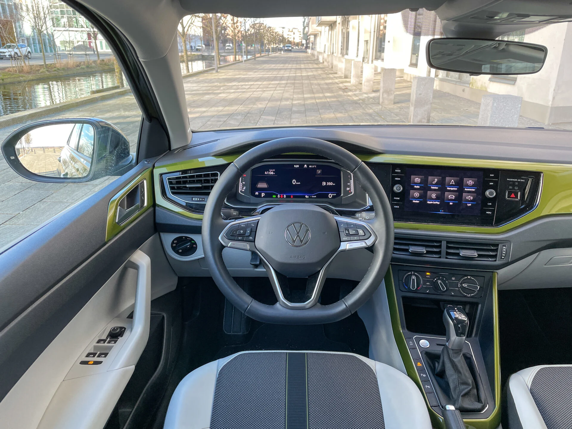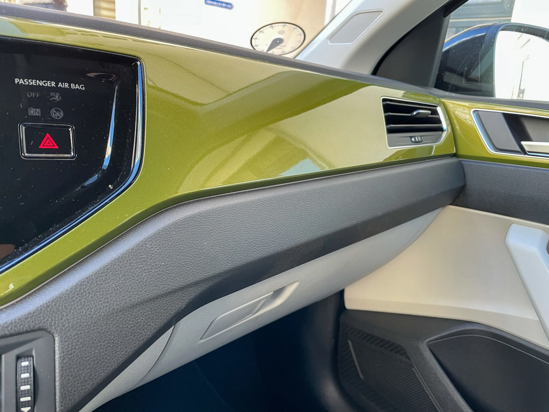 Til en merpris á 1.895 kr. er Taigo testbilen blevet udstyret med en Styling-pakke, der hiver eksteriør-farven ind i kabinen. Det er et slapt forsøg på at gemme den uendelige mængde af sort og utiltalende plastik med et plastpanel, der stadig er utiltalende: Nu bare i farven grøn.