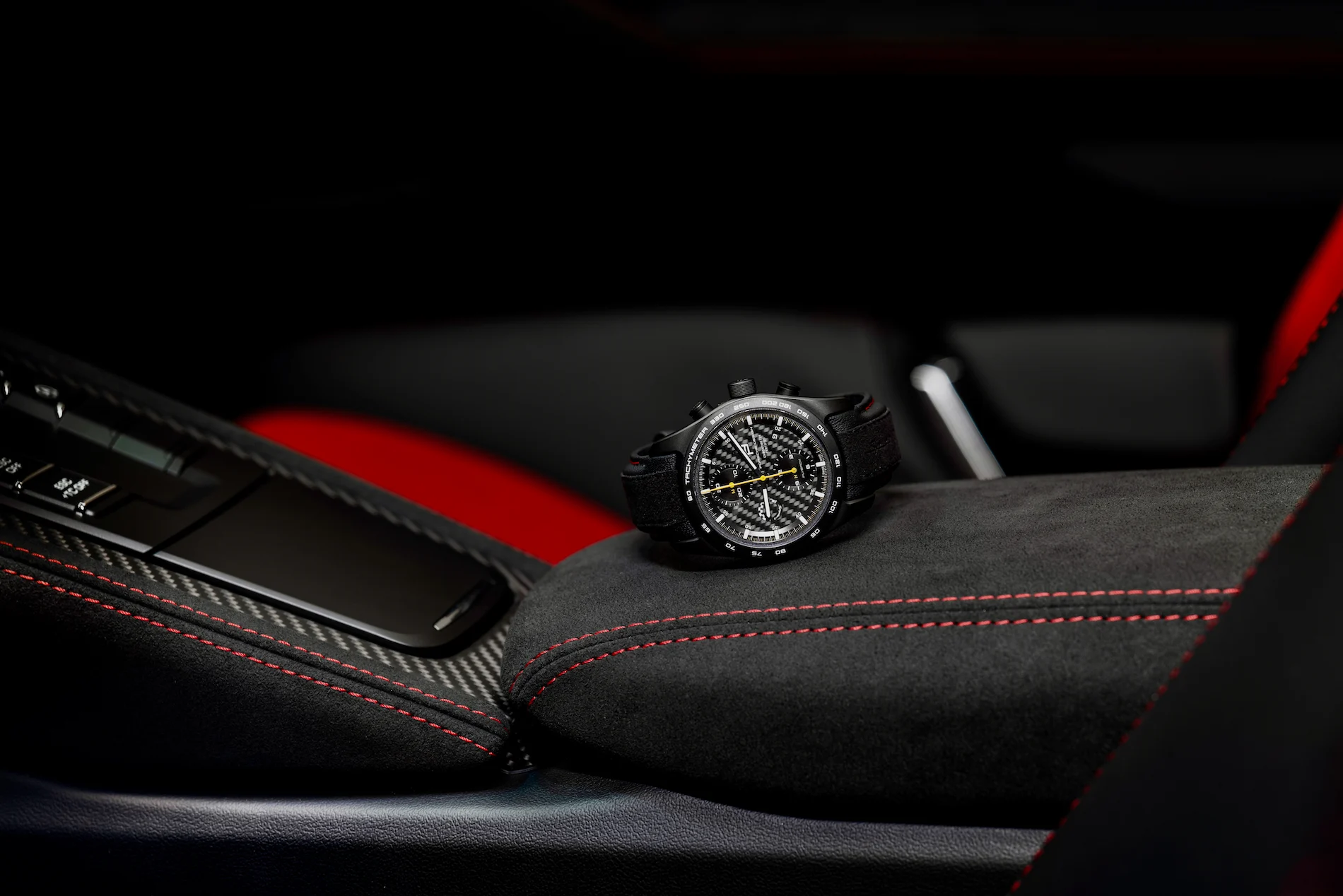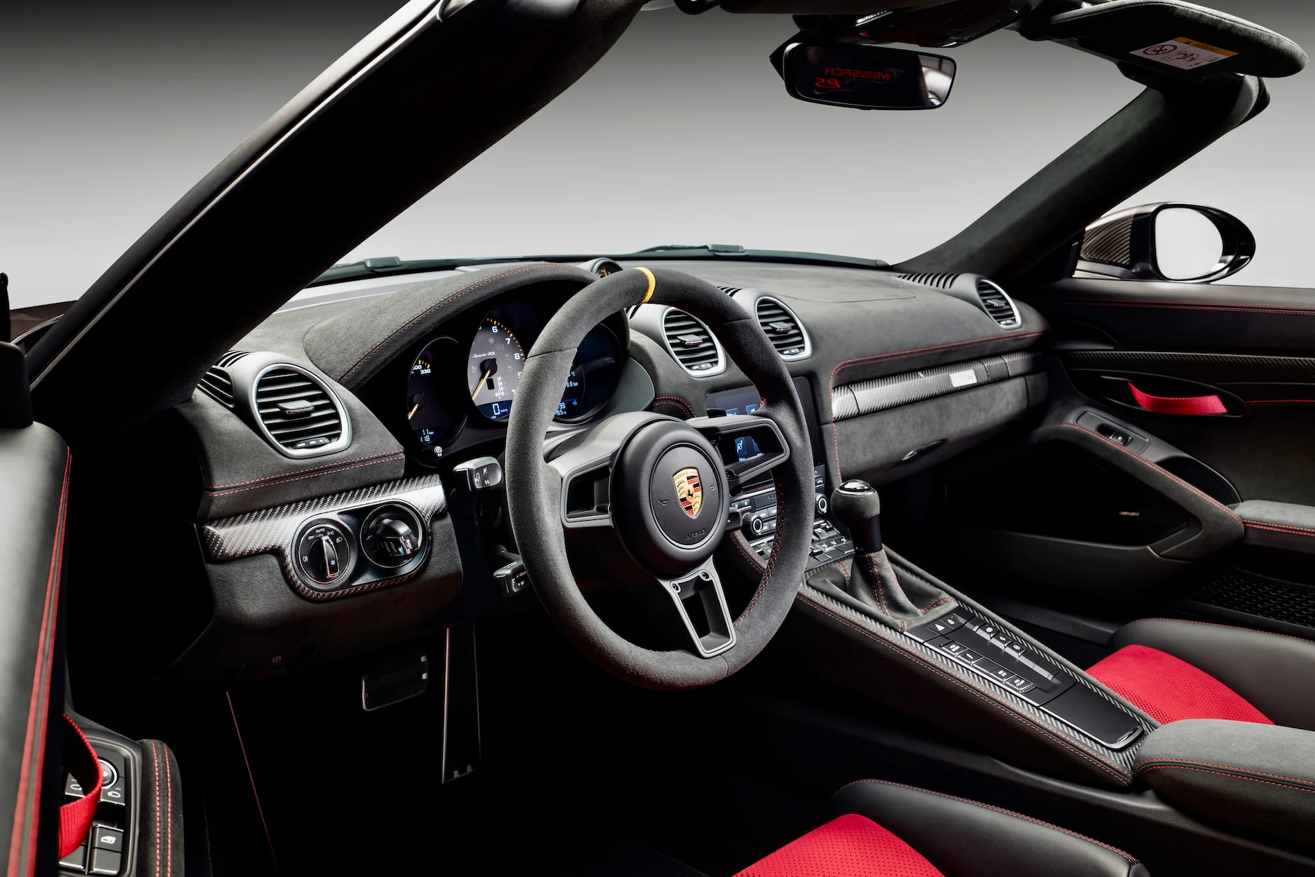 Den såkaldte Weissach-pakke med blandt andet (endnu) lettere 21″ hjul og afgangsrør i titanium er ekstraudstyr – og den inkluderer også et kronograf-ur fra Porsches egen urproduktion i Soliturn i Schweiz.