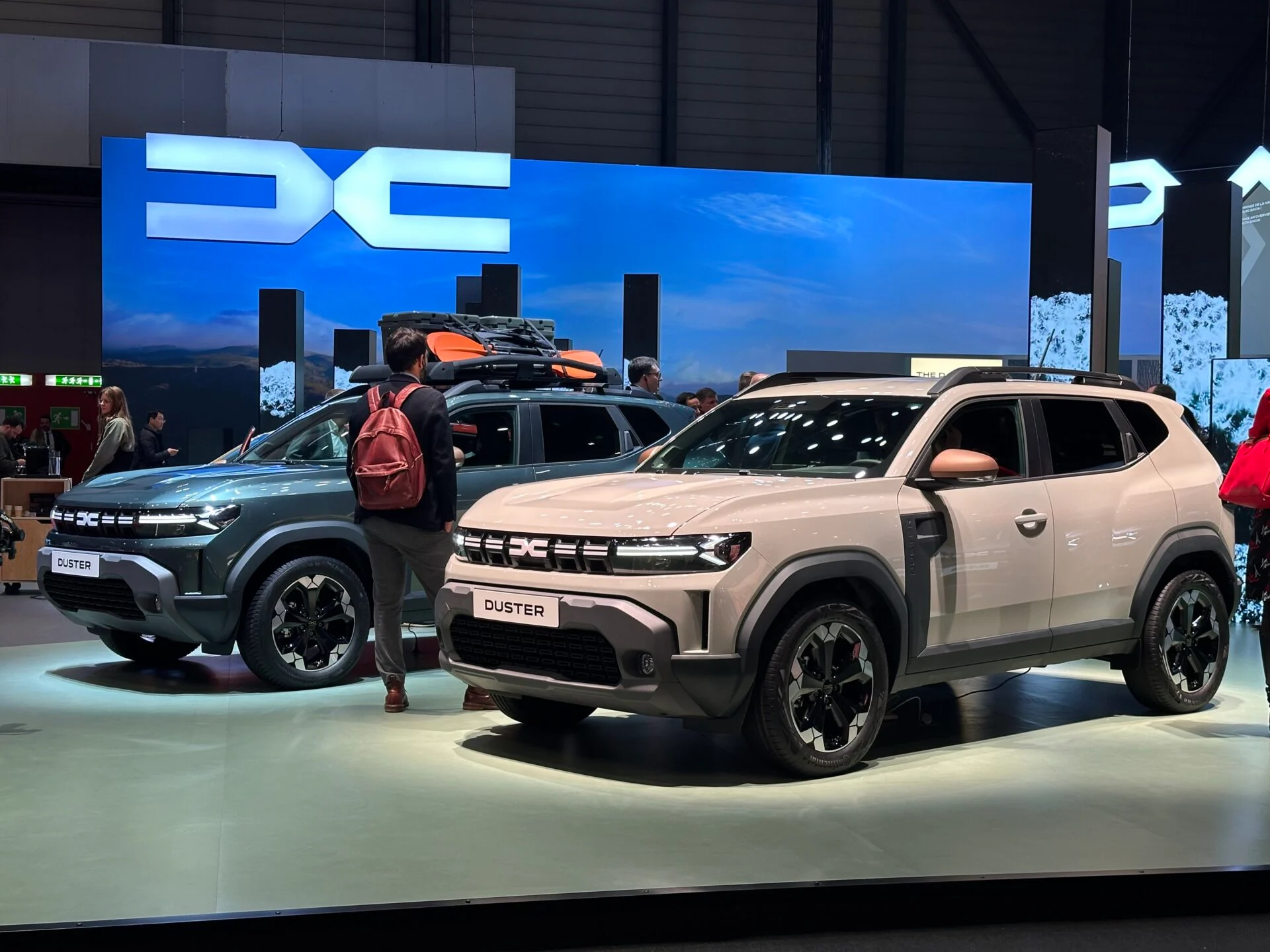 På standen står den nye Dacia Duster blandt andet med tagbøjler og overlevelsesgrej, der hjælper folk til at se, hvad den skal kunne. Her ligner den virkelig en hårdfør fætter til terrænet, hvilket er præcist det, Dacia vil have frem.