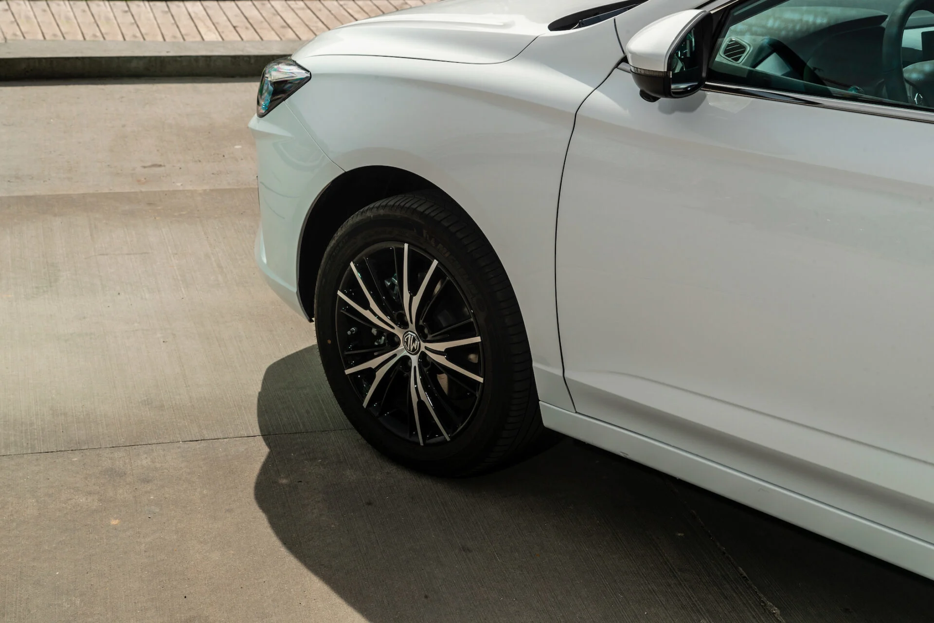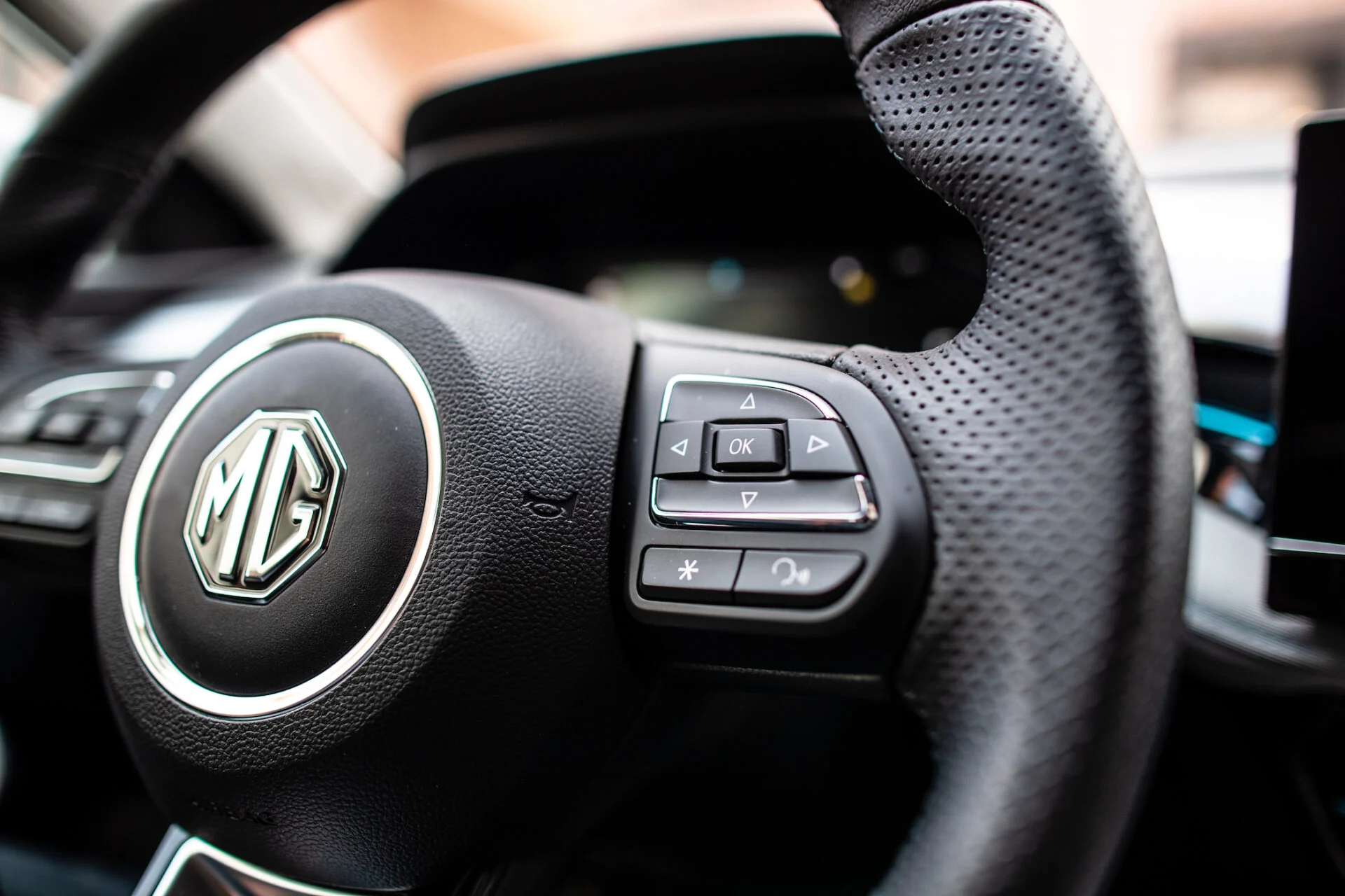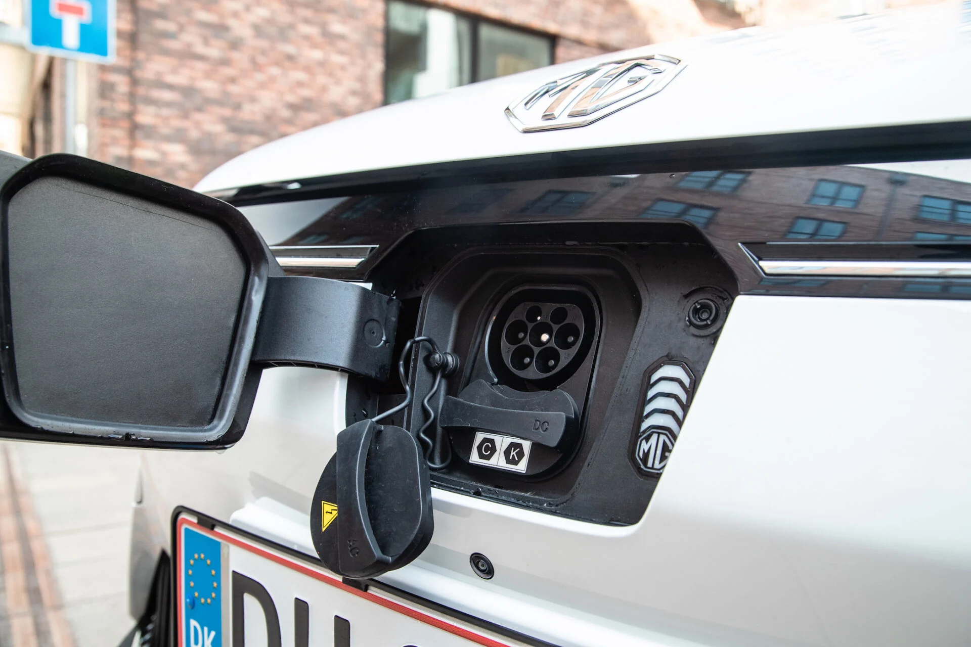 Designet er pænt, anonymt og almindeligt. Men læg mærke til, hvor langt der er mellem øverste kant af dækkene og toppen af hjulkasserne. MG har været nødt til at hæve undervognen, fordi 5’eren egentlig er lavet som benzinbil – og så senere konverteret til el. Det store batteri, som samlet set er 61,1 kWh, ligger i bunden af bilen under sæderne, og det skulle helst ikke støde på noget på vejen, så derfor er undervognen høj.