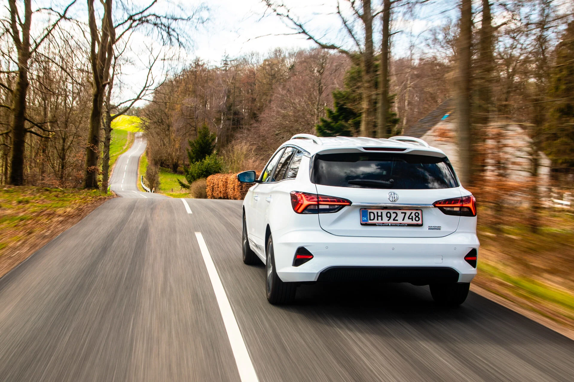 En stationcar er normalt lav, men med sin hævede undervogn er MG5 Electric næsten en crossover. 154 cm høj, så den er 1 cm højere end en Ford Puma og kun lidt lavere end VW T-Roc. Det får den kinesiske stationcar til at se ud som noget, der kan klare en pløjemark (det kan den nok ikke), og man kunne være nervøs for, at det ville give gyngende køreegenskaber. Jeg kaster MG5 Electric gennem en række meget skarpe sving, venter på at krængningen får det hele til at falde til jorden, så ESC-systemet kan skride ind og stoppe galskaben. Det sker aldrig. Selv uden nævneværdig stivhed i undervognen er krængningen forudsigelig og langt fra voldsom, og da den elektriske stationcar har bedre styretøj end de andre biler fra MG, er den en udmærket køreoplevelse.