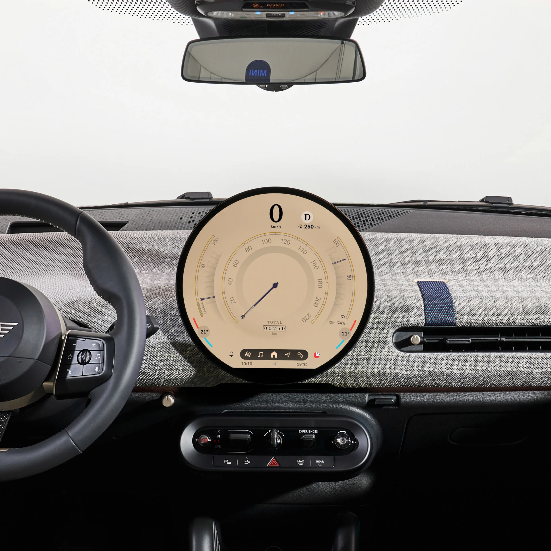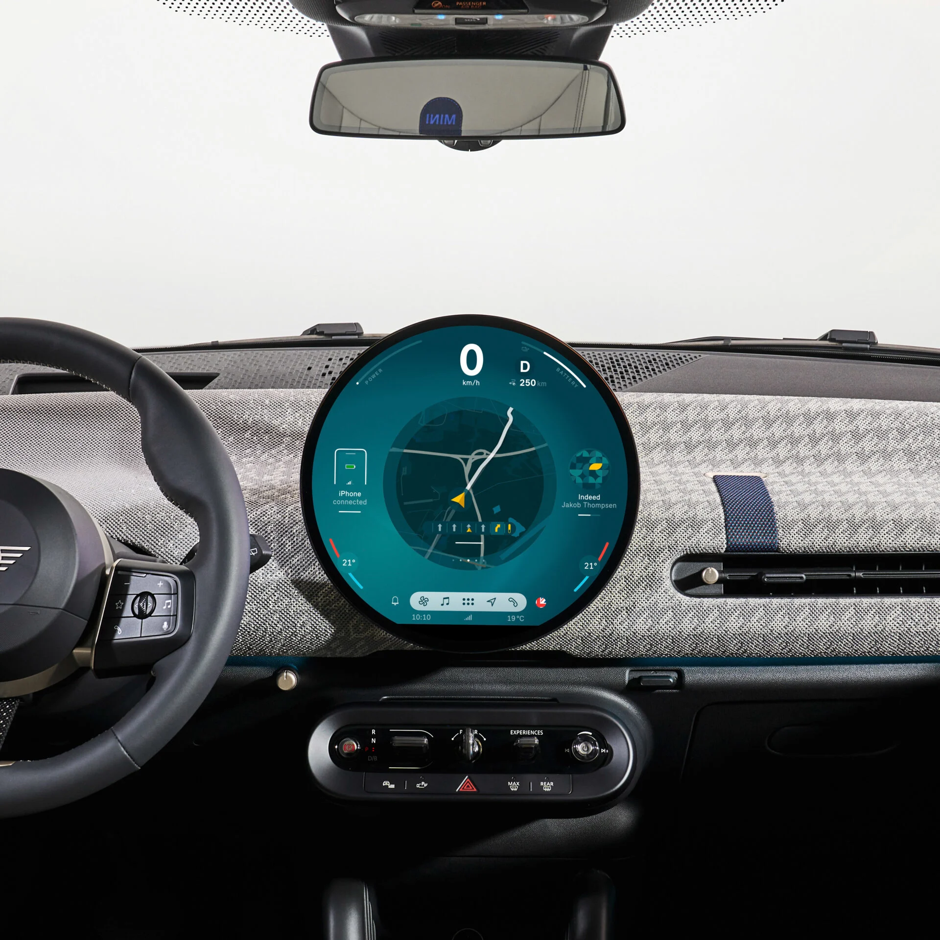 Minimalistisk og moderne. Den runde skærm på 24 cm løber med den indledningsvise opmærksomhed. Den er ikke kun fed, fordi den er rund, men også fordi den er klar og farverig i opløsningen samt udstyret med et lækkert styresystem. Mini Operating System 9 ligger sig op ad BMW iDrive men med et lidt mere legende, lidt mindre teknisk kompliceret tag.