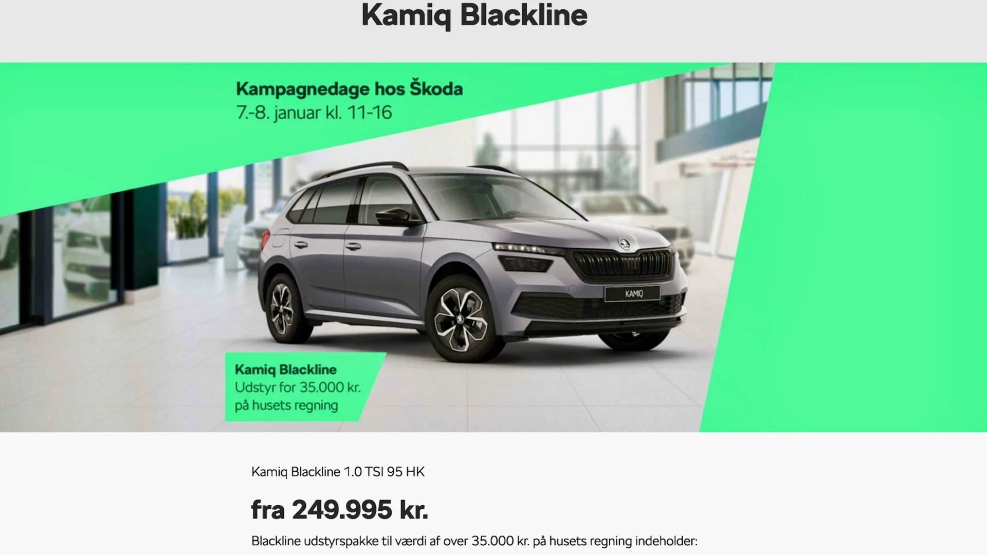 Kamiq og Scala sælges i kampagneperioden som Blackline med udstyr, som giver en besparelse på henholdvis 35.000 og 33.000 kr. Når kampagnen slutter, kører varianterne videre – men så til fuld pris.