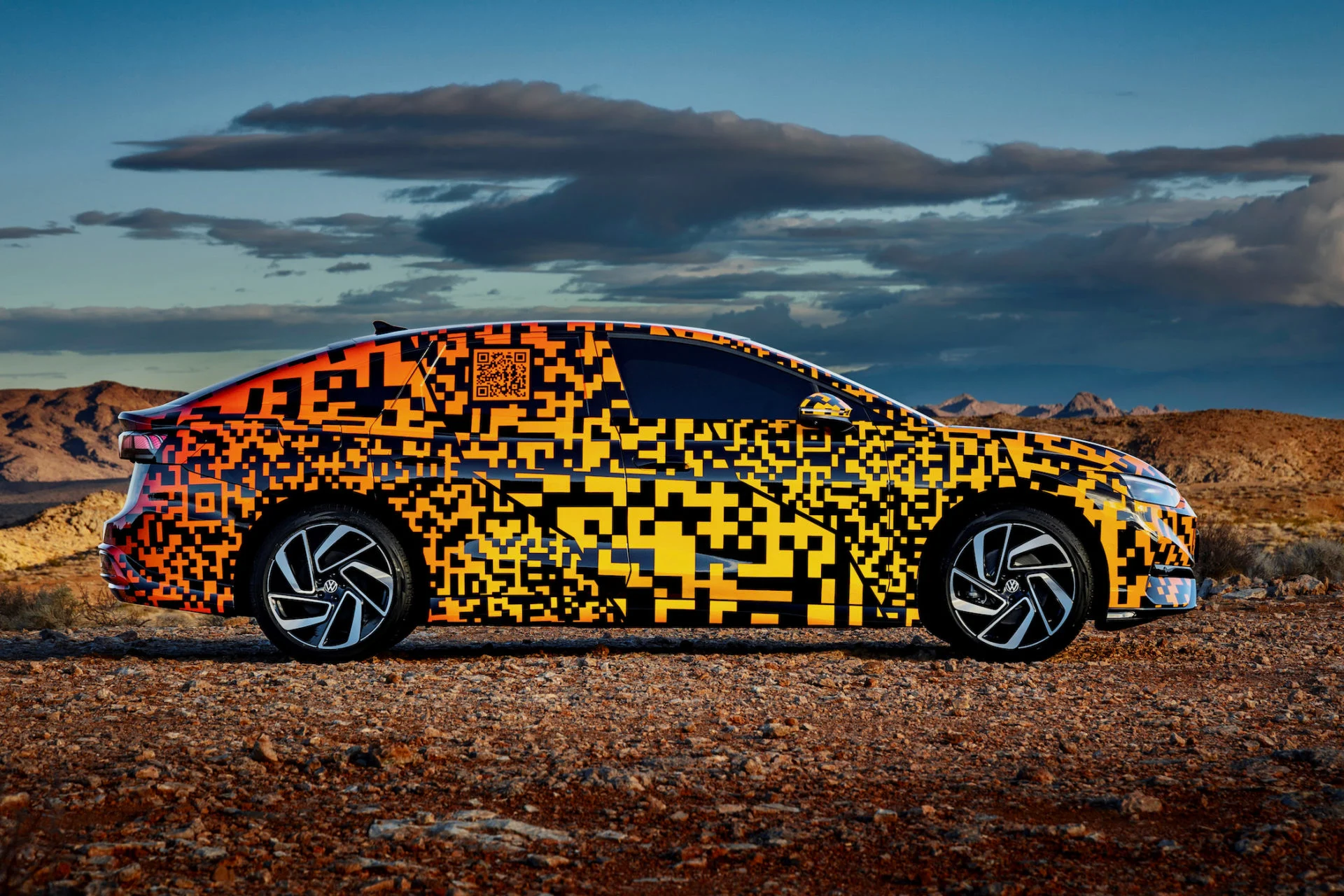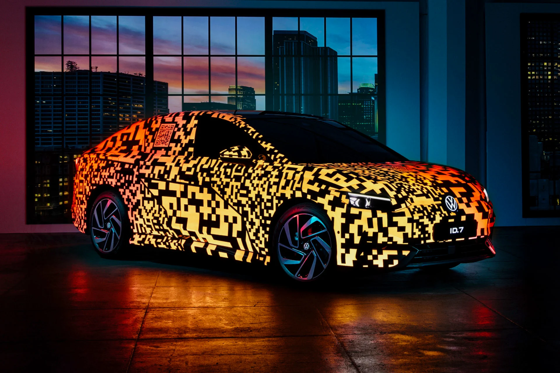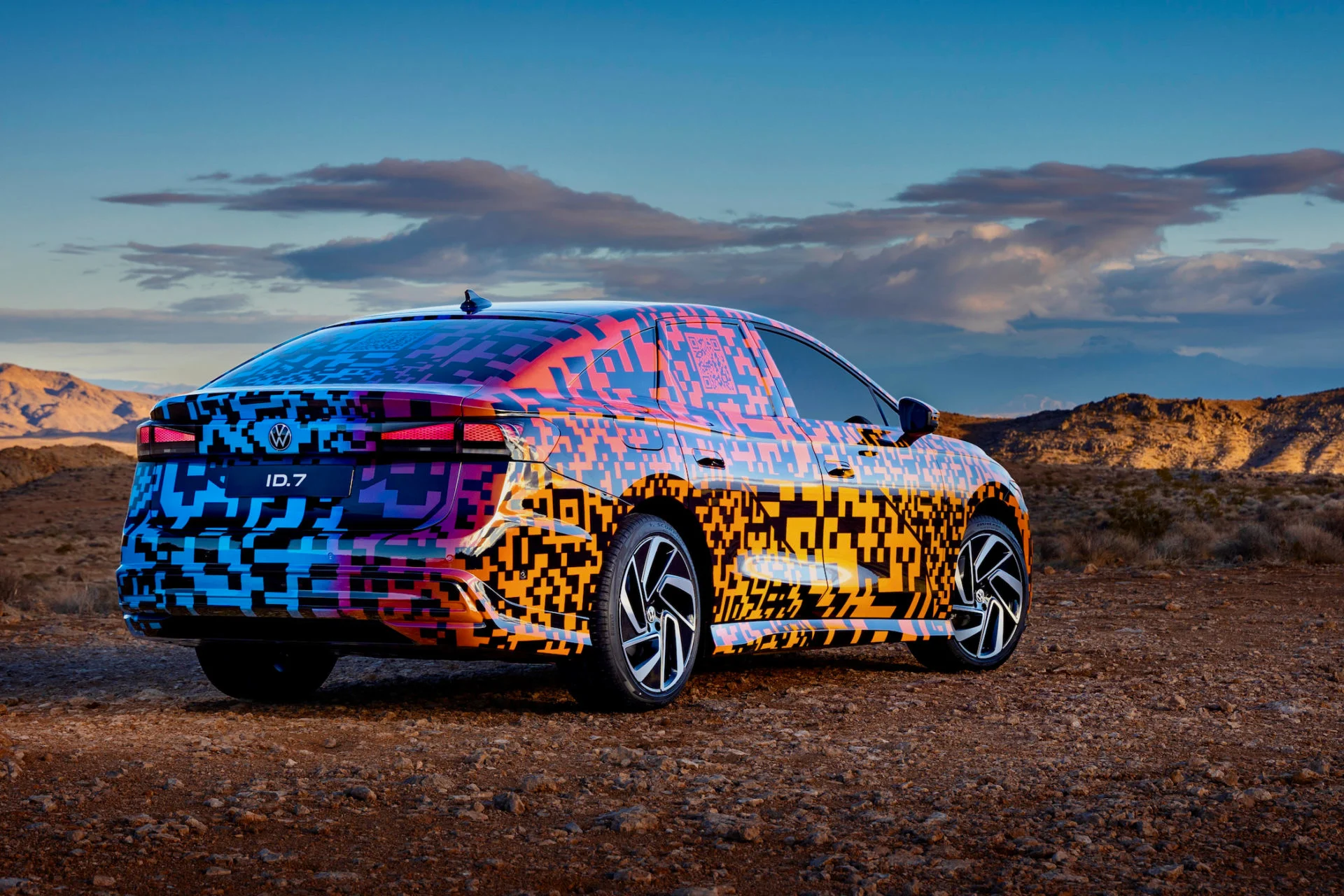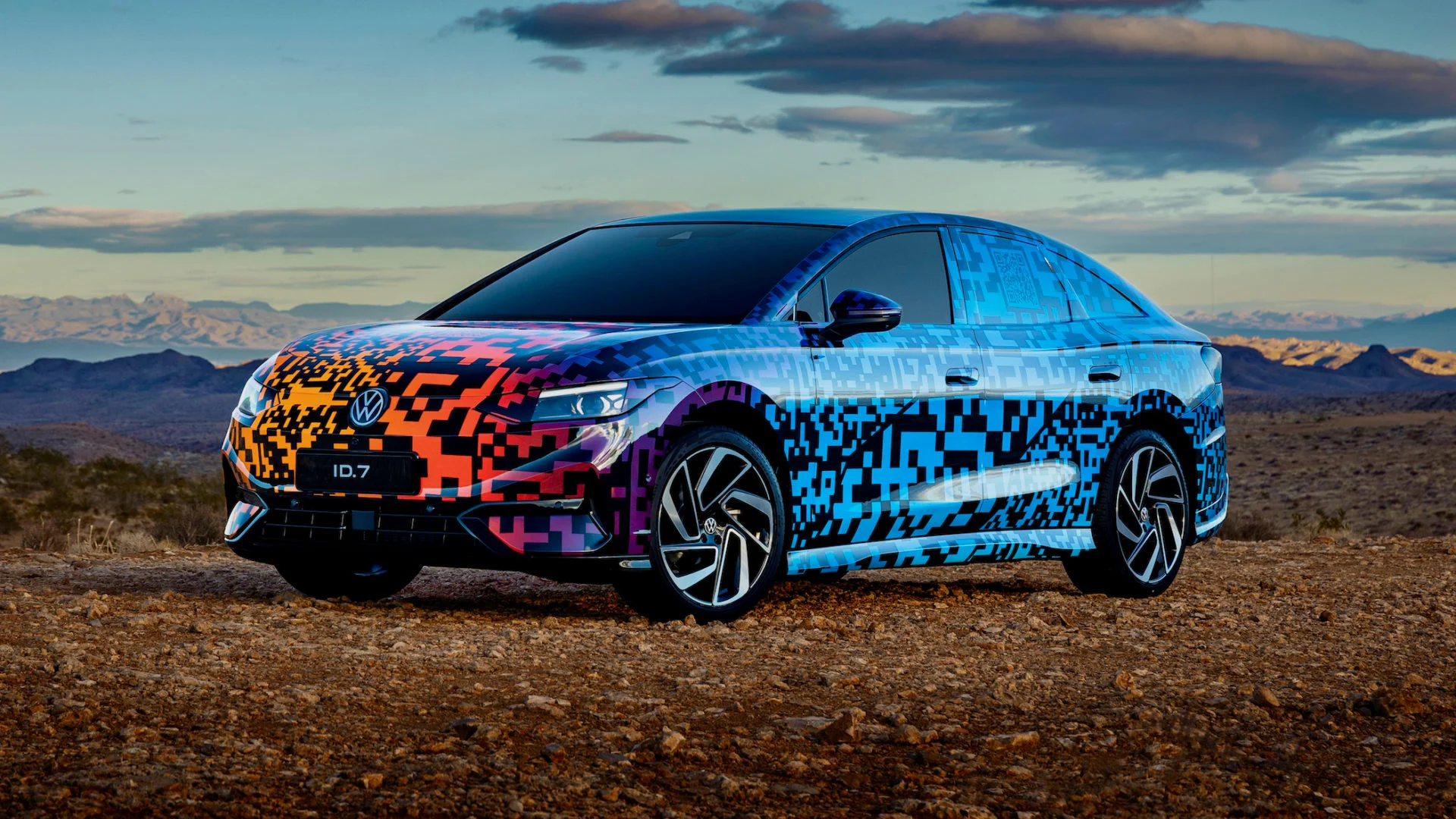 Under farverig og interaktiv kamuflage gemmer VW sin elektriske topmodel ID.7. Den gemmer på rækkevidde op til 700 km – og den pakkes ud i foråret.