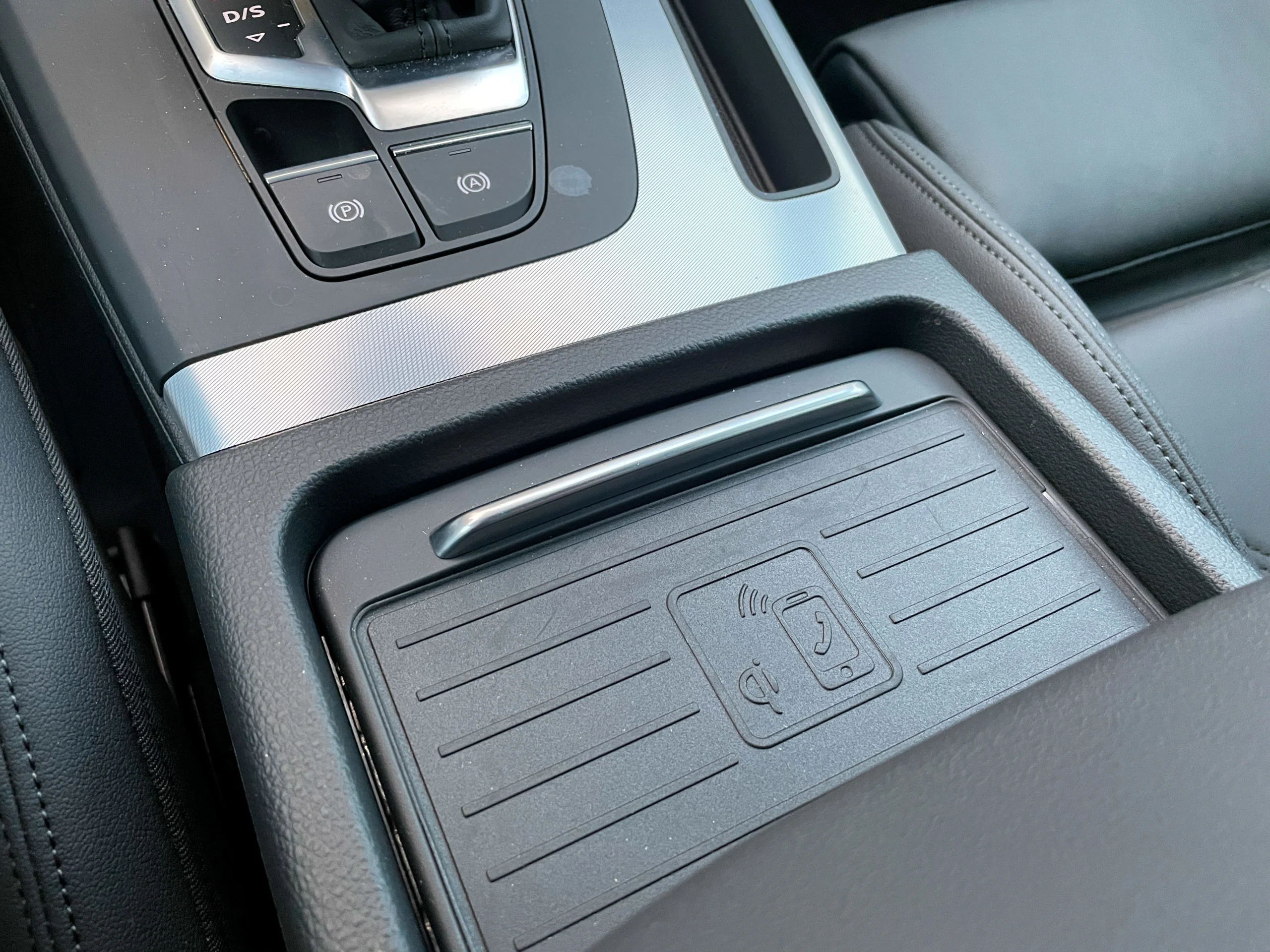 Bortskaffelsen af hjulet ved gearstangen har frigjort plads til et lille, åbent aflæggerum, Men aflæggeplads er ellers ingen stærk side af Q5; kopholderne er små og sidder langt bagude. Mens det er småting, så er det stadig ridser i en pæn lakering. Man sidder nemlig sublimt i de faste sæder. Og armlæn, afstand til rattet og den generelle indretning af førerpladsen er meget funktionel.