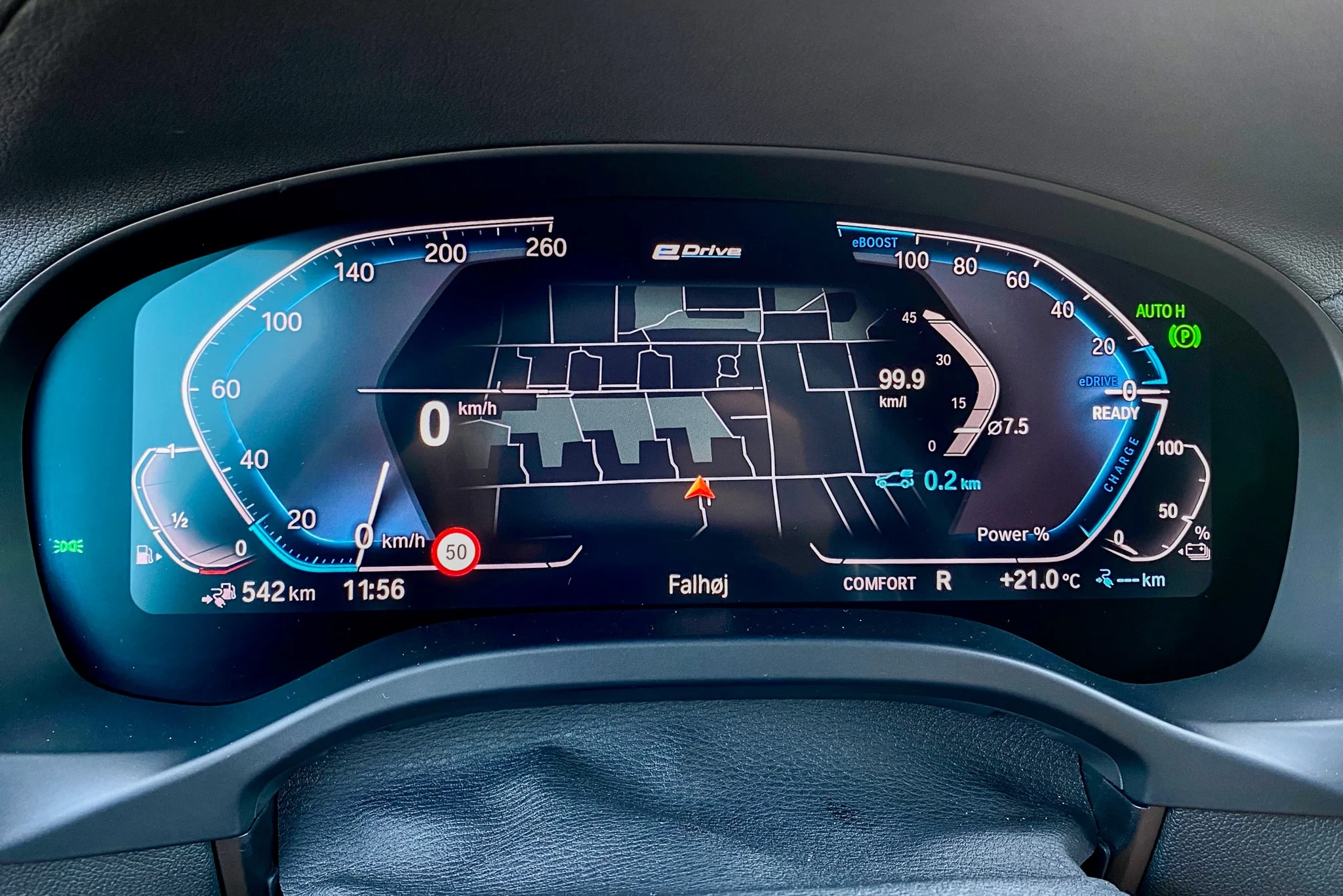 Med strømmen intakt på batteriet, da jeg starter med cirka 38 km til rådighed, sætter jeg navigationen til på vej til min destination. På den måde regner systemet ud, blandt andet ved at se på vejtype, stigninger og kørsel i byen, hvornår strømmen bruges bedst og mest miljørigtigt. Det er en lille, men fascinerende ting. Sætter jeg køreindstillingen på ren el, får jeg brændt de 38 km af længe inden, jeg har kørt 38 km. Lader jeg X3 styre showet, så den kører som hybrid og selv tilpasser brugen af benzin og strøm, rækker strømmen længere.