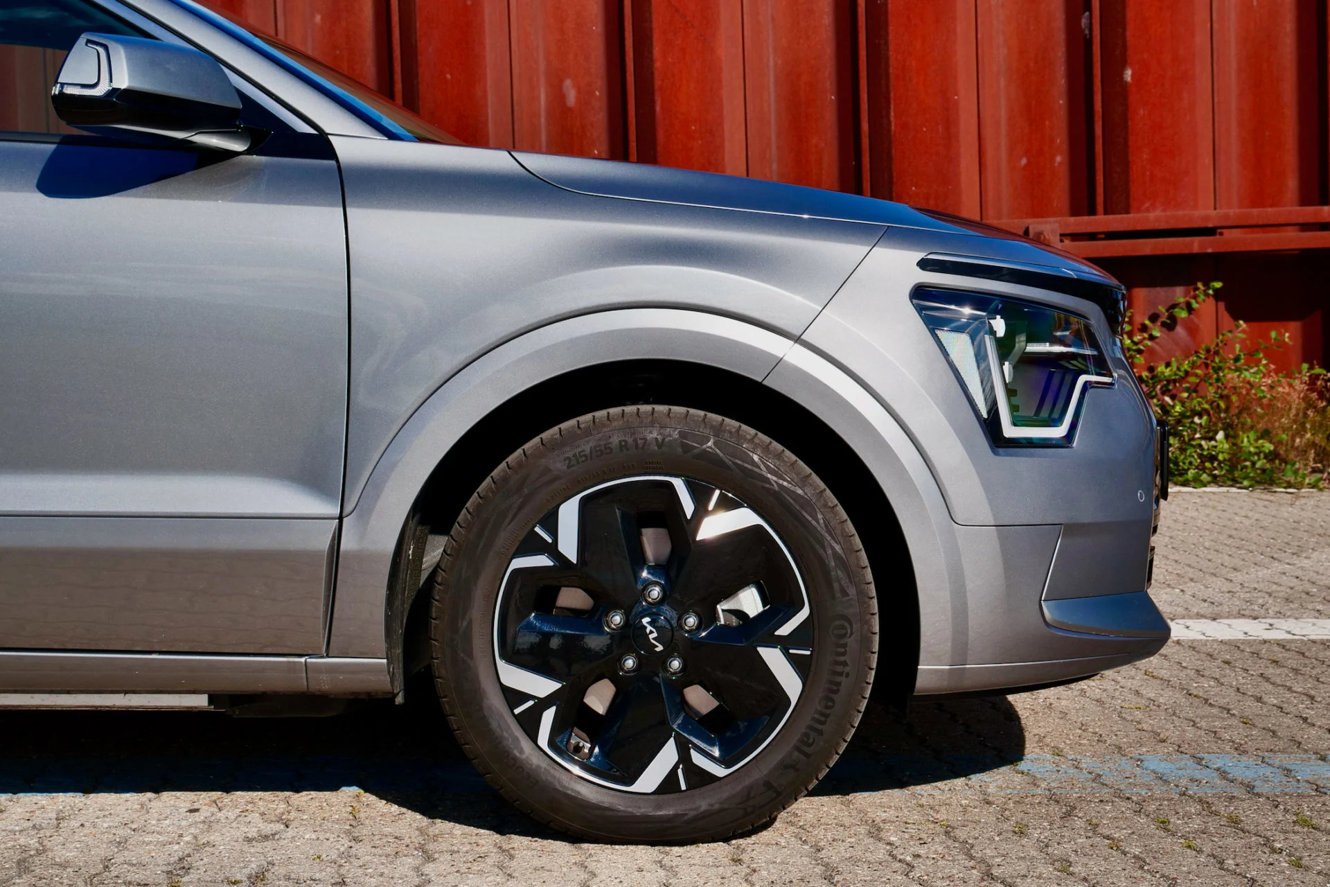 Designet både for og bag er så udpræget anderledes, at det hurtigt kommer til syne, at midten af bilens karrosseri, hvor vi finder dørene ser for almindelige ud. Som om Niro er bygget med dørene fra den gamle model. Og ladeporten? – Den sidder gemt midt i bilens front, lige under det sorte panel, der går på tværs.