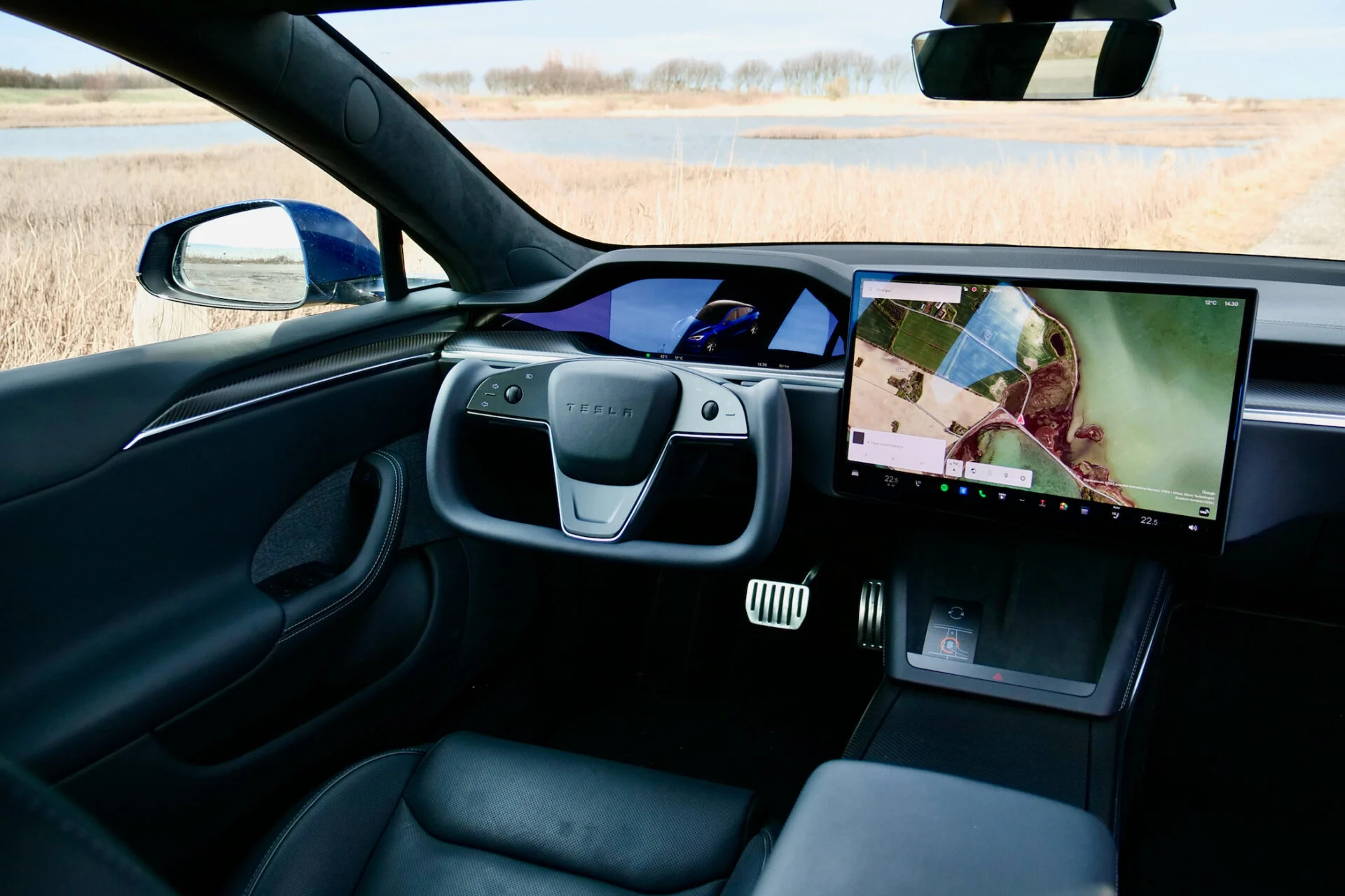 Jeg finder det besynderligt, at man skal vælge gear, nærmere betegnet køreretning, ved at køre fingeren op eller ned på en smal stribe på den store skærm. Fingrene rammer ikke altid præcist nok, og hvis jeg har lyst til at have handsker på, fordi det er hundekoldt i bilen, kommer jeg ingen steder. Det kan skærmen ikke klare. Hvis de 1.020 hk i Plaid er det, der sluger mest opmærksomhed, så ligger rattet meget tæt på. Det er ikke et rat, som vi kender rattet, men et yoke. Det er som roret på et fly, for der er ingen øverste krans, som dækker instrumenteringen. Genialt, for så kan ingen køre med hånden liggende øverst på rattet, som kun er med til at gøre bilen ustabilt.