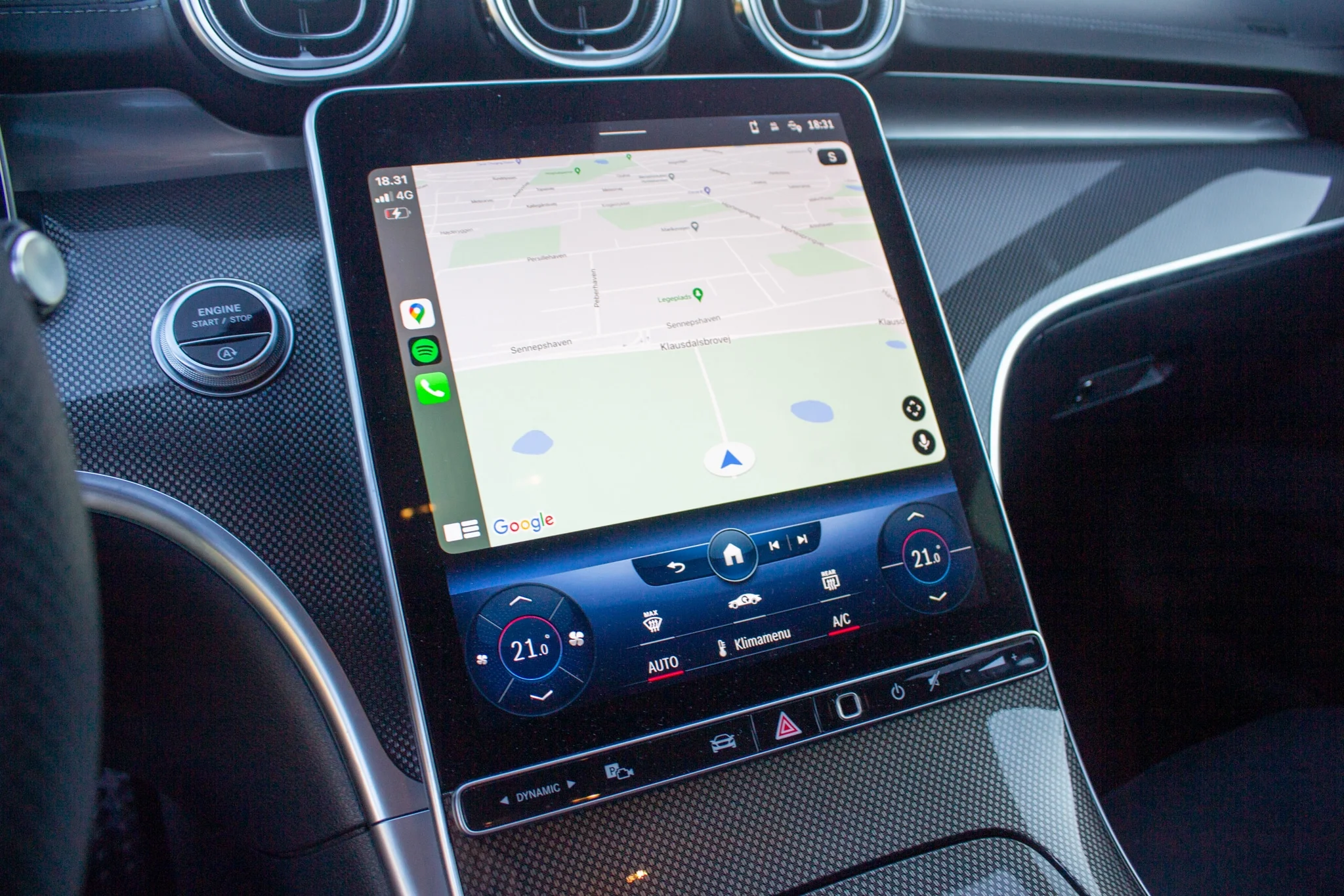 Den store og flotte skærm kan heldigvis mere end blot at se godt ud. Det allerede prisværdige MBUX-system fra Mercedes har i den nye C-Klasse fået den seneste opdatering, der er en fryd at bruge. Integrationen af det trådløse Apple CarPlay er spot-on, og det krystalklare display på 12,3 tommer bag rattet bistår infotainmentskærmen i sin anvendelse, så øjnene kan holdes på vejen. Klimaanlægget styres også på infotainmentskærmen men på et statisk område i bunden, der fungerer fint.