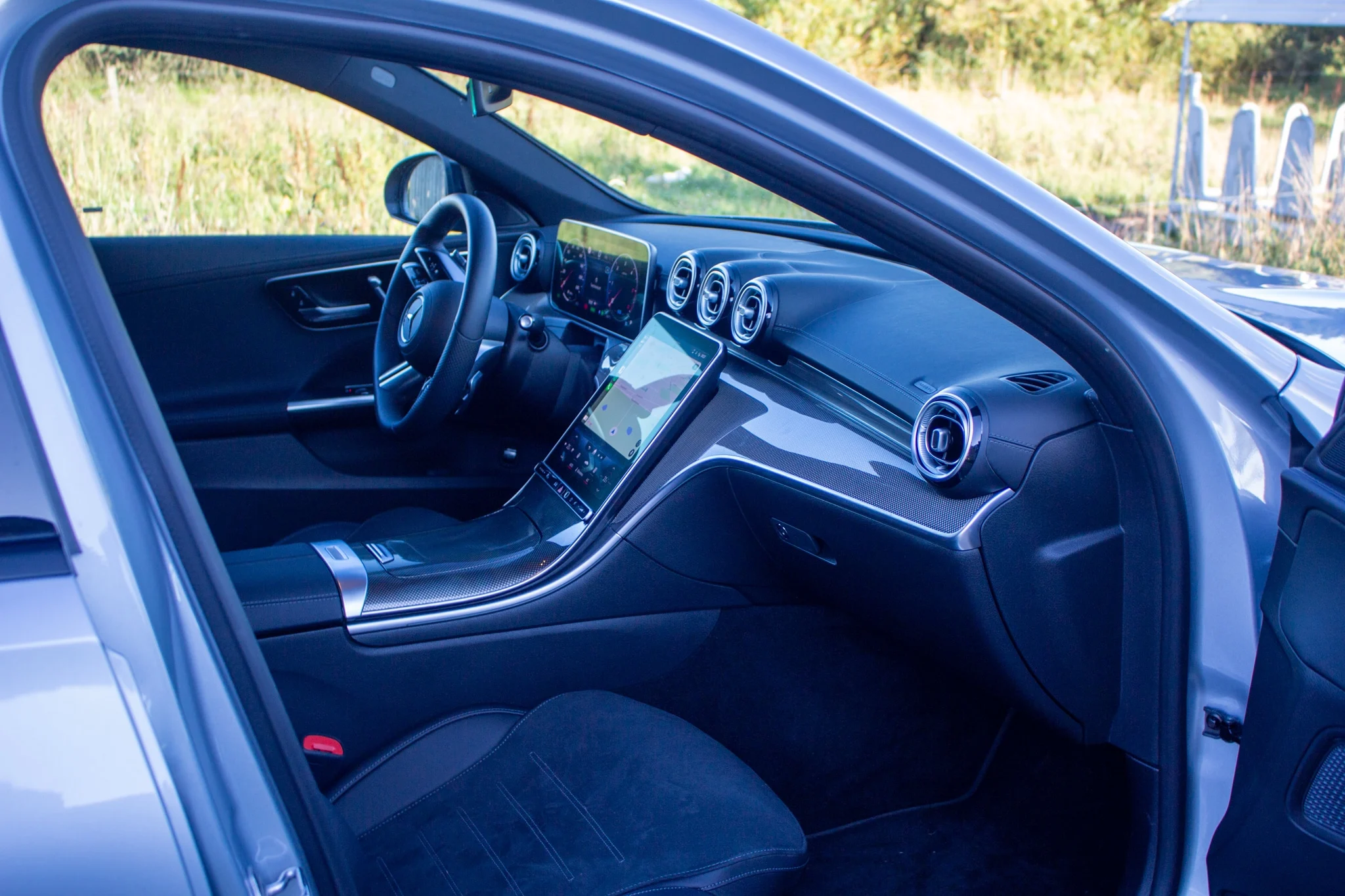 Lad os starte et sted, hvor den nye C-Klasse skinner igennem og tydeligt har fået lov at låne lidt fra storebror S-Klasse. Kabinen er en wow-faktor, så snart man sætter sig ind. Her er det selvfølgelig den 11,9-tommer store iPad-lignende skærm i midterkonsollen, der tager fokus.