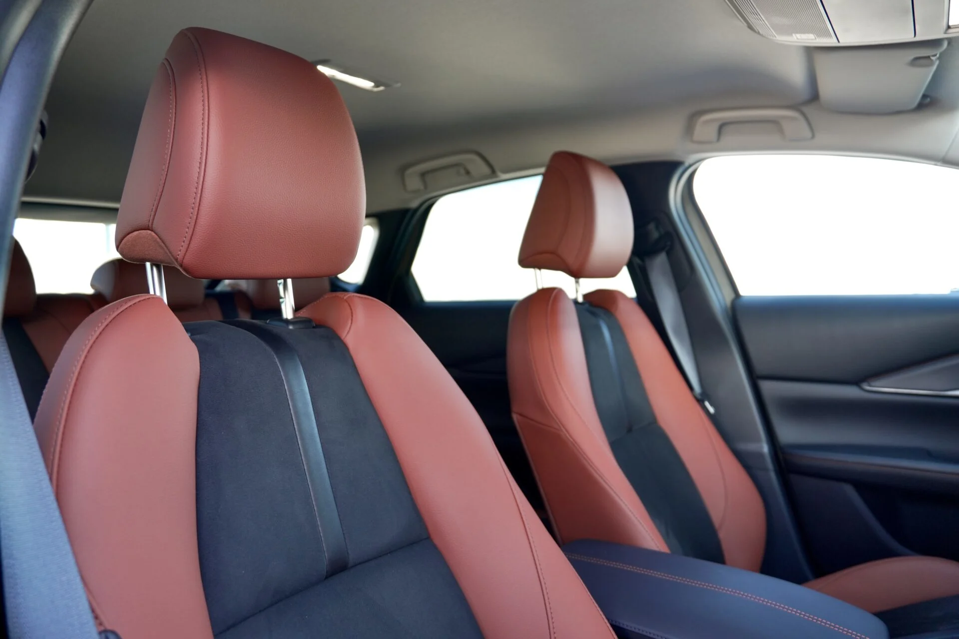 Så skøn CX-30’eren ydre er at skue, lige så lækkert er dens interiør i materialer, som kan placeres i en bil til den dobbelte pris uden at få anmærkninger. Der er imiteret ruskind i sort på dele af sæderne og noget af instrumentbordet, og det terracotta-farvede kunstlæder på sæderne, om man kan lide det eller ej, giver et ekstra strejf af luksus.
