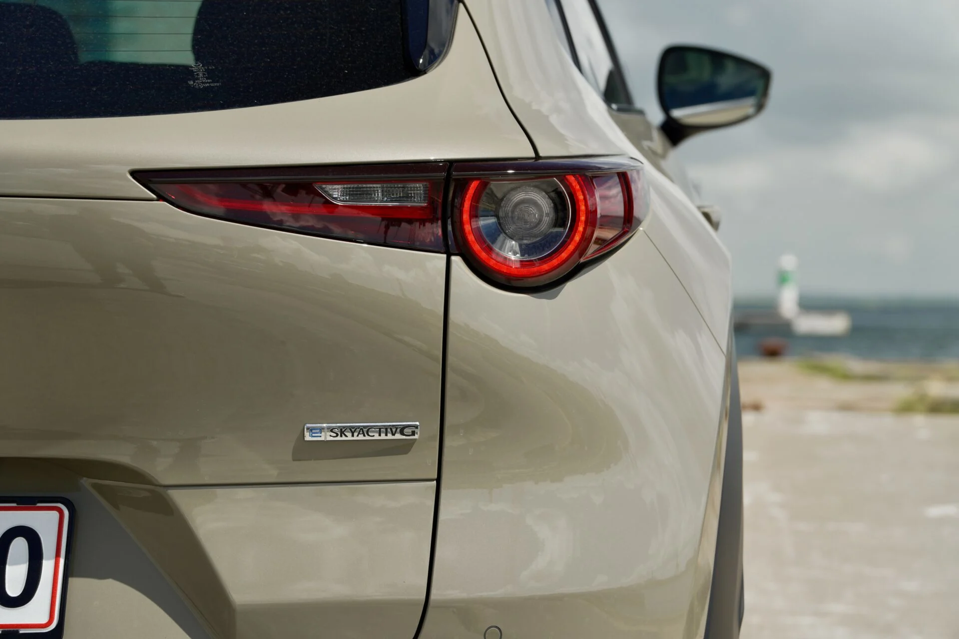 Det stiller altså CX-30 i et rigtig godt lys. Og jeg må bare sige, at efter snart fem år i produktion ligner den japanske crossover en bil, der kunne være tegnet i går. Intet ved dens ydre fortæller om bilens fremskredne alder, og den nye farve Zircon Sand (8.500 kr.) og de sorte 18” alufælge, som følger med det nye udstyrsniveau Nagisa, får CX-30 til at stråle.