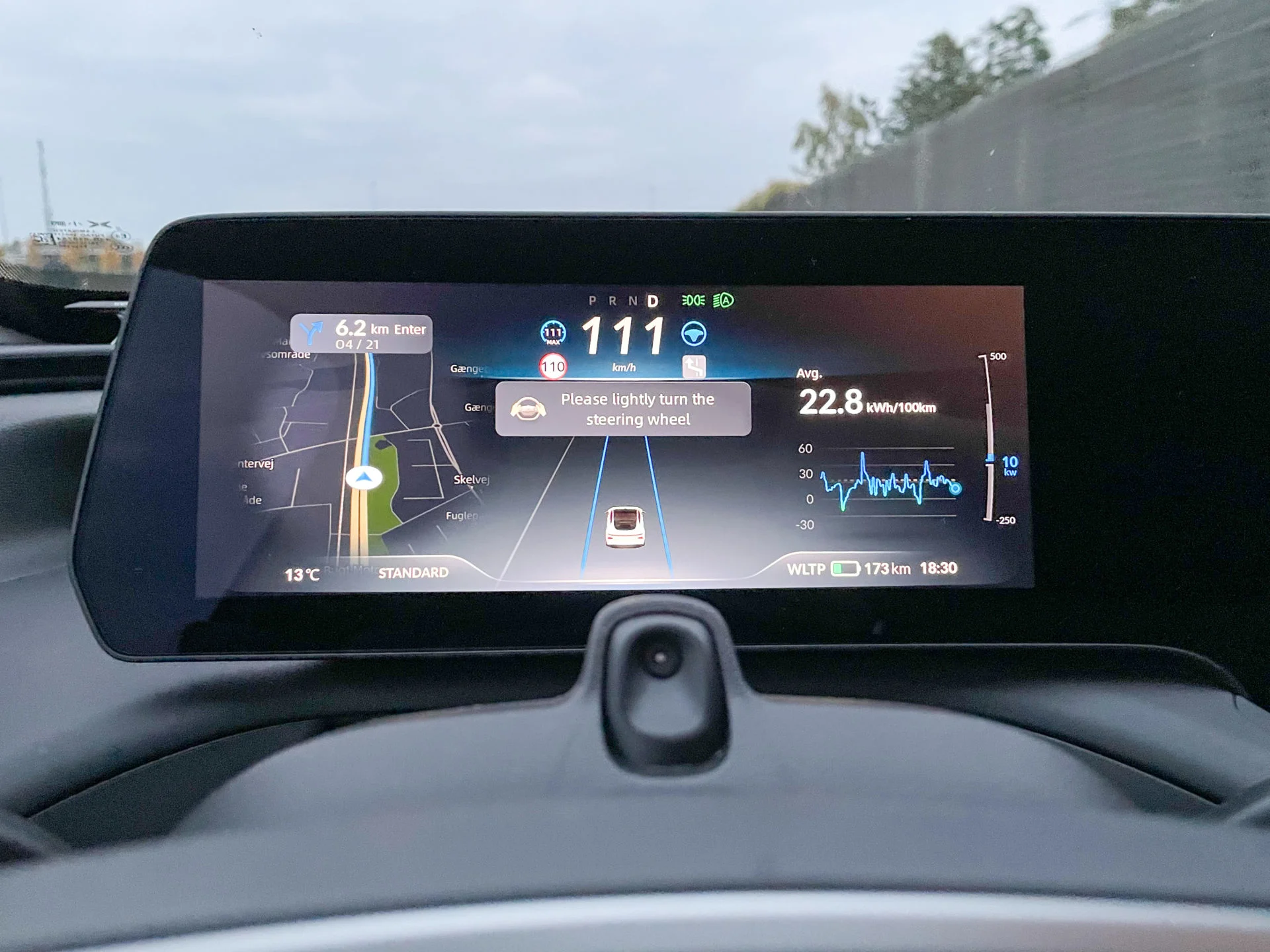 Det er derimod ikke fint, at grænsen mellem et bekræftende ryk og et ryk, der slår systemet fra, er ultrasnæver. Derfor kommer man til at slå det fra konstant. Når det, ligesom Tesla, skal aktiveres igen på gearvælgerstilken, er det kun hver anden gang, den lystrer på kommandoen. Der er nogle hastigheds- og trafikmæssige forhold, der skal være opfyldt, før den vil være med.