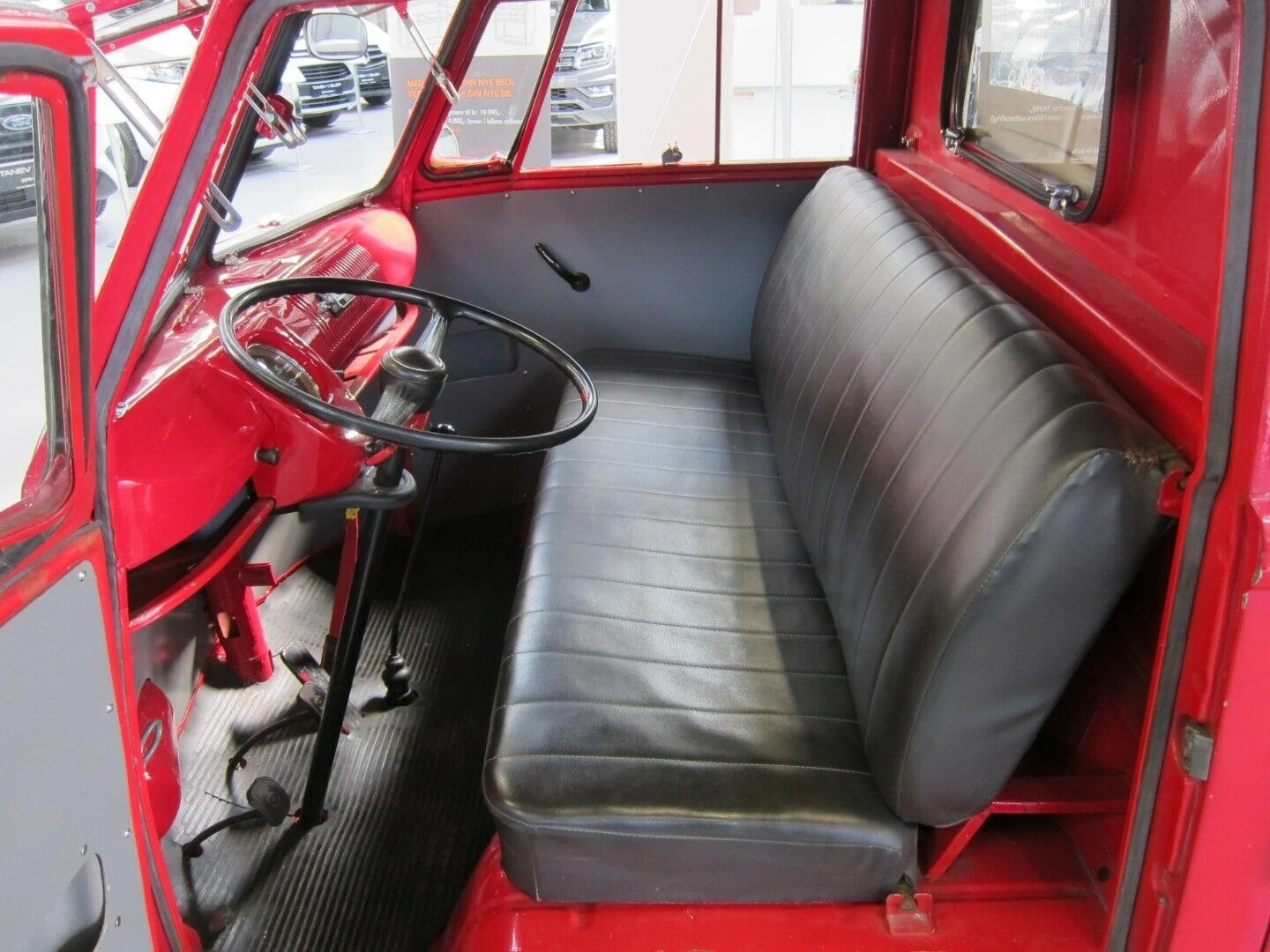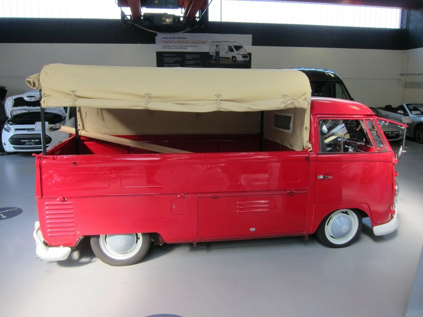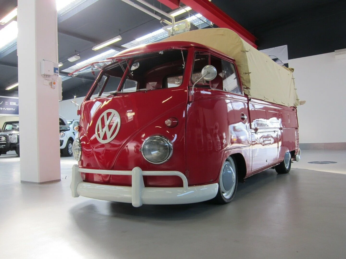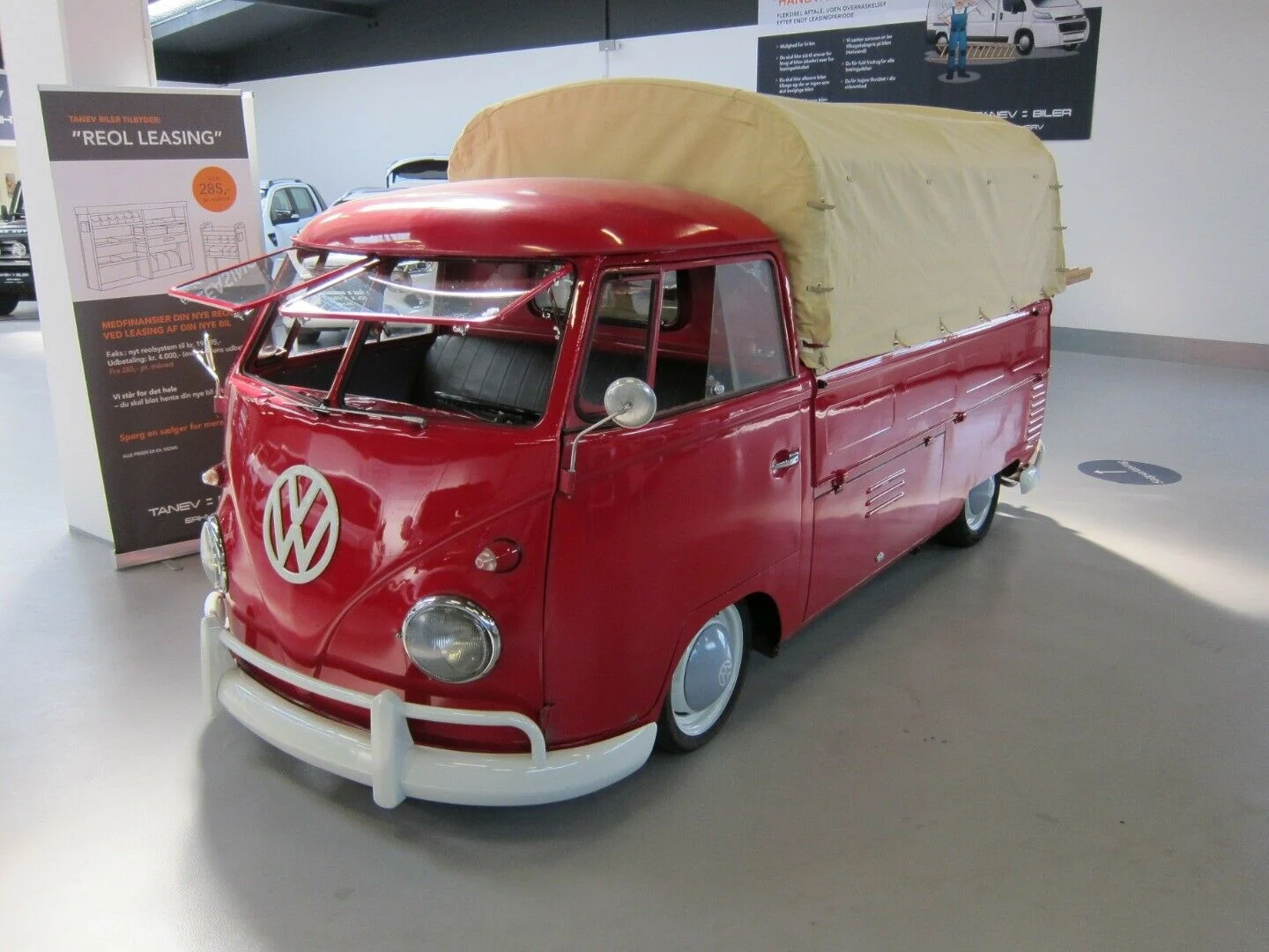 Det er en nyrenoveret VW T1 pick-up med safarivinduer, hvide kofangere og en sandfarvet kaleche over ladet bagved. Det er en knaldrød retrovogn, der har ramt os lige i hjertekulen.