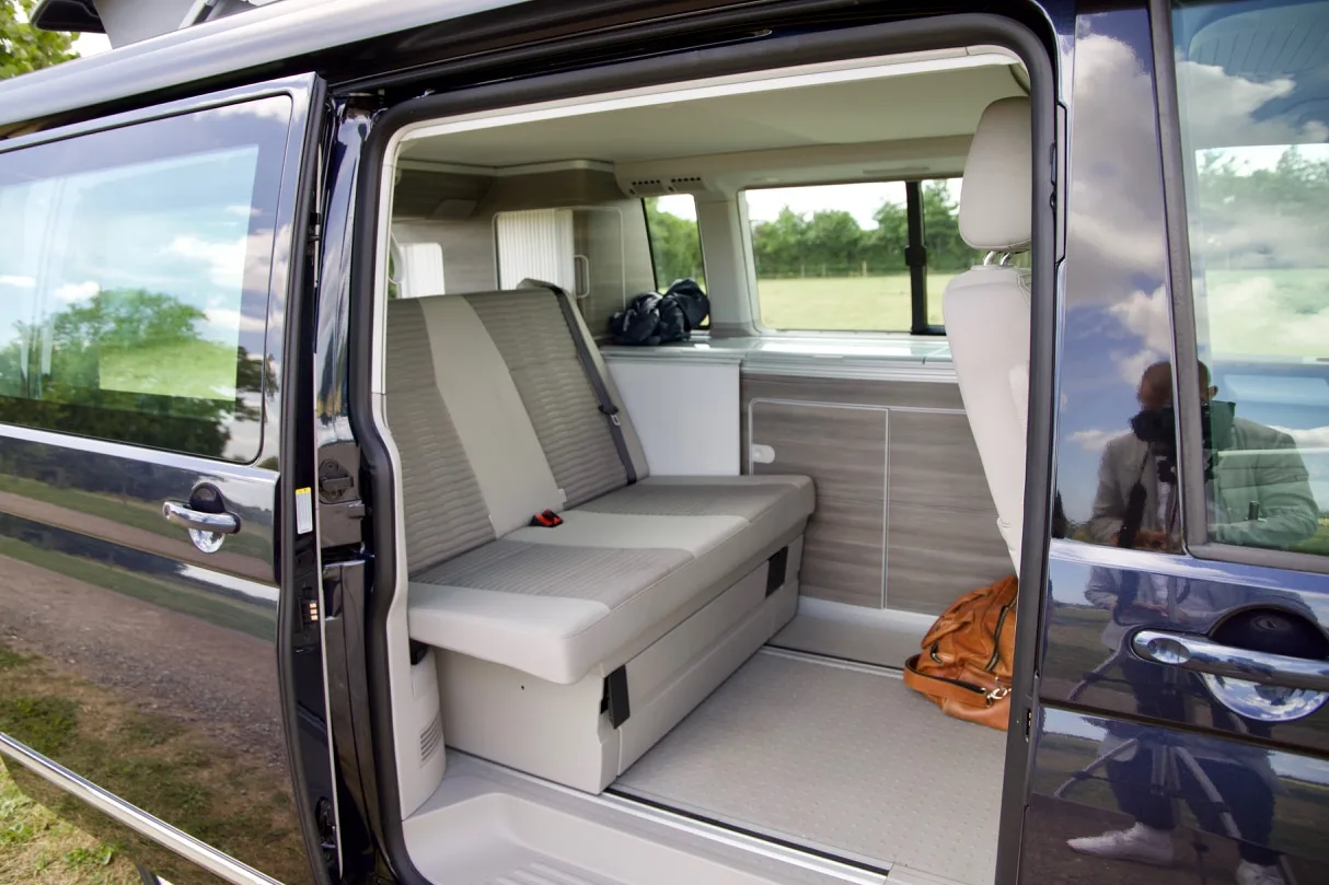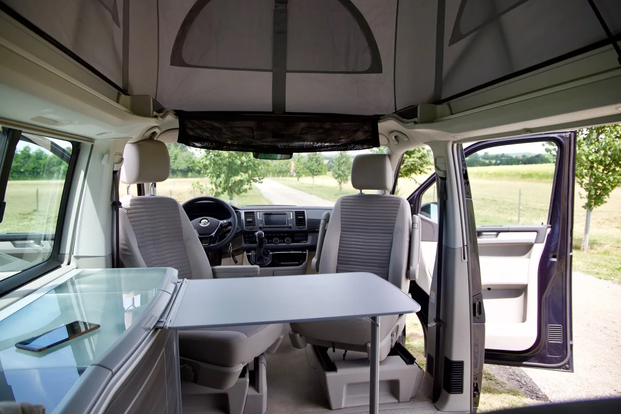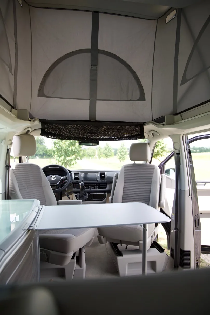 De forreste sæder kan vendes om, så familien kan sidde samlet omkring bordet og spise eller spille spil, og hvis de øverste sengepladser ikke er i brug, kan sengen hæves, så det er muligt at stå fuldt oprejst inde i bilen.